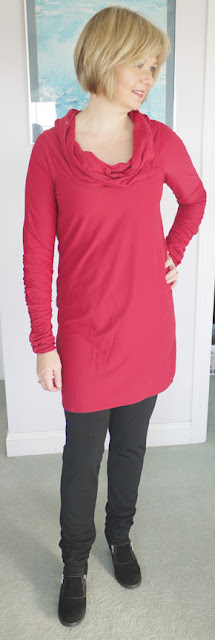I like the huge drapey cowl collar. But, I would be careful with the fabric choice. My fabric is very thin, and I think that is good for this style. This pattern is perfect for thin rayon jerseys. I think that if you were using a beefier cotton interlock or even a poly jersey, the cowl and the sleeves would get too thick. The short sleeve version of this shirt shows a modified collar that isn't as big, so if I were to make this pattern with something thicker, I would probably use that collar instead.